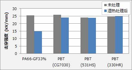 未处理时、各PBT品级和PA66-GF33%的击穿强度差异不大。而实施湿热处理后、只有PA66-GF33%大幅降低了约40%。如上所述、由于PA66的吸水率较高、很可能是由于吸水导致了击穿强度的下降。