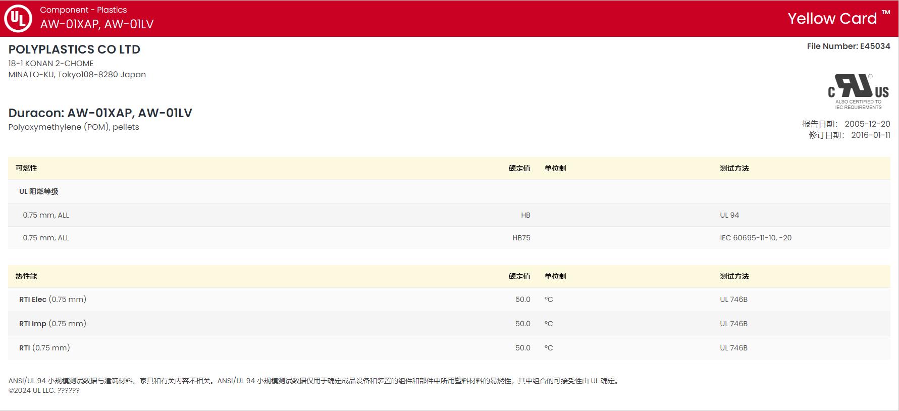 | 可燃性 | 额定值 | 单位制 | 测试方法 |