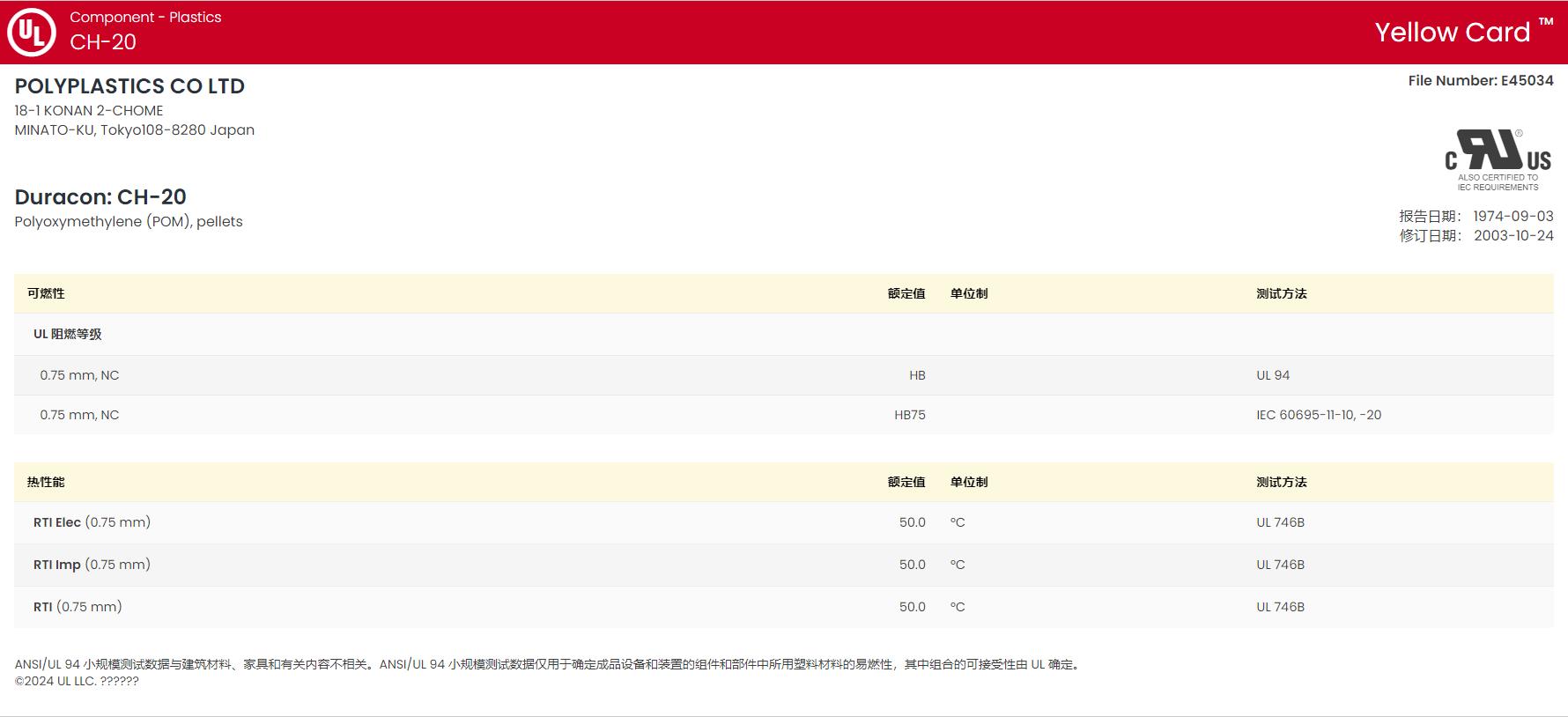 | 可燃性 | 额定值 | 单位制 | 测试方法 |