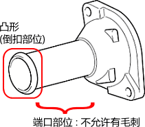 通常,冷却系零件和橡胶软管的连接部分呈凸形,所以在模具设计上会产生倒扣形状。如果采用滑动脱模机构,在分型线(模具的接合部)处就会产生毛刺。而这种连接部分(端口部分)的毛刺可能会导致漏气或者橡胶软管损伤,所以一般不被容许。因此需要对成型品进行去毛刺处理,或者采用已经在聚酰胺类材料中运用的拉拔成型(拉拔成型的说明参见后文)工艺。但由于PPS材料本身较脆,至今为止基本上不采用拉拔成型,而是采用去毛刺的方法,这也导致了成本的增加。