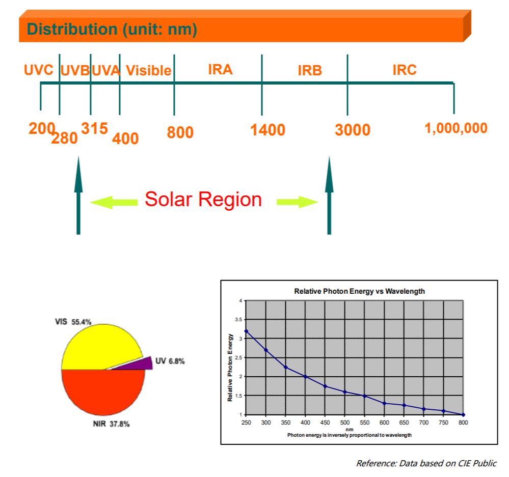 由太阳能组成的光谱如下。到达地球表面的太阳能是从UVB到IRB的。UVB透玻璃窗时会被阻挡。太阳能辐射产生的紫外线速率很小,约为6.8%,但含有较高的能量,可以破坏塑料的化学键。