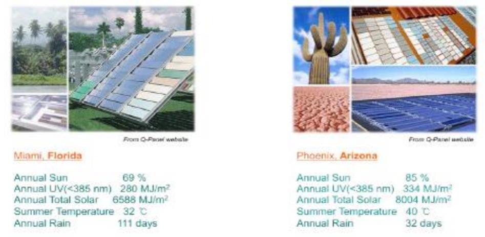 户外暴露试验正在各个地区进行,但一般来说,国际试验方法所需的地区是佛罗里达州和亚利桑那州。佛罗里达州有一个标准的,恒定的气候,而亚利桑那州的特点是高强度辐射和大白天范围干燥的气候。在韩国瑞山有一个家庭户外暴露场所,可以看到海水和海风的影响。著名的国际户外暴露测试地点有华雷斯、墨西哥、澳大利亚昆士兰、巴西克鲁兹阿尔塔和日本冲绳。